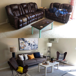 Take a look at both of the “before” photos pictured above. You’ll notice there are a lot of personal art pieces on the wall and every surface – including the floors and the corners of the room – are covered. There is too much clutter. This is why we start by decluttering… Start with the “smalls,” then we’ll worry about the “bigs.”